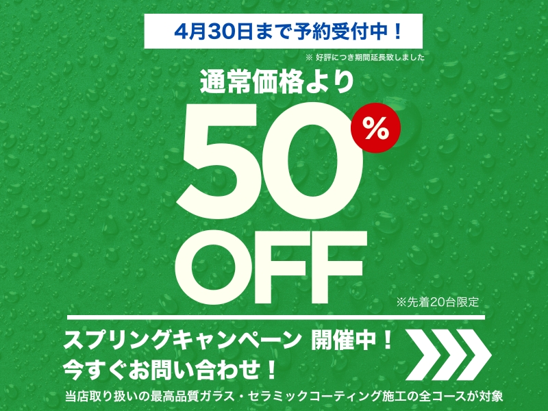 キャンペーン期間中にお見積・お問合せを頂きました方を対象に、当店取扱いの『最高品質ガラス・セラミック コーティングの全コースの全車種を対象に50%OFF大幅割引キャンペーンセール』を完全台数限定にて実施致しております。